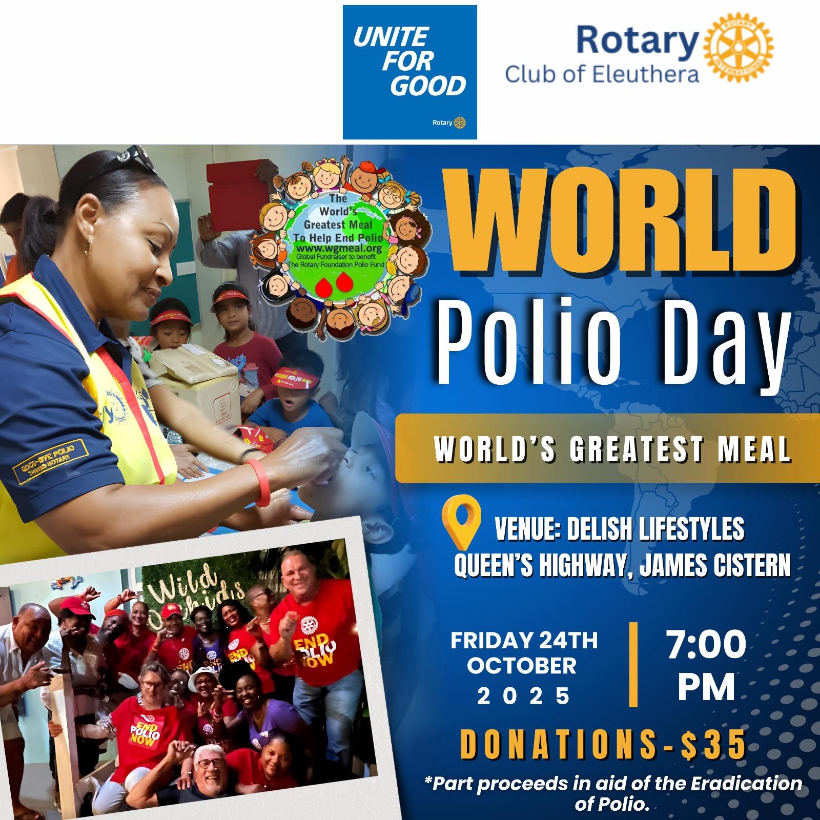 Rotary Clubs around the world host fundraising events and make donations to assist with the eradication of Polio. The Rotary Club of Eleuthera partnered with Delish Lifestyles Sports Bar, James Cistern, Eleuthera also in conjunction Economic and Community Development efforts, to host the World's Greatest Meal Fundraiser. It was a memorable evening shared with Rotarians, family and friends. It was also a pleasure to have visiting Rotarians John Fortney from the Rotary Club of Toronto, Canada and Harrison Lockhart from the Rotary Club of Old Fort, Nassau.